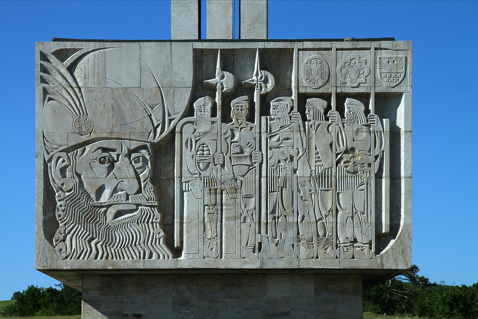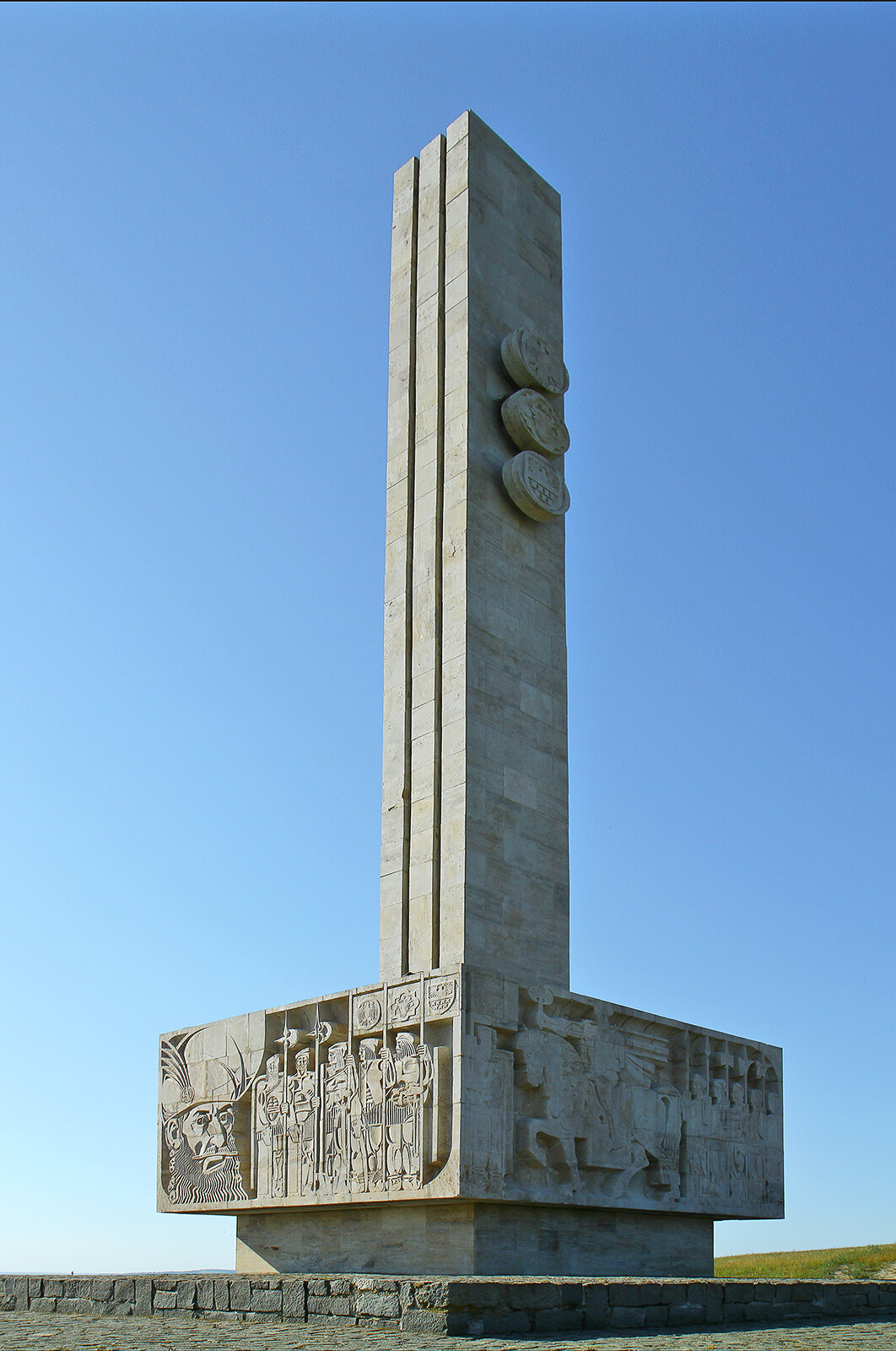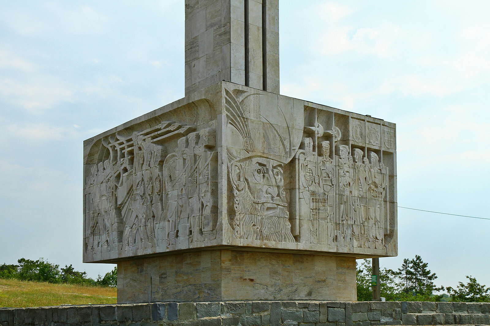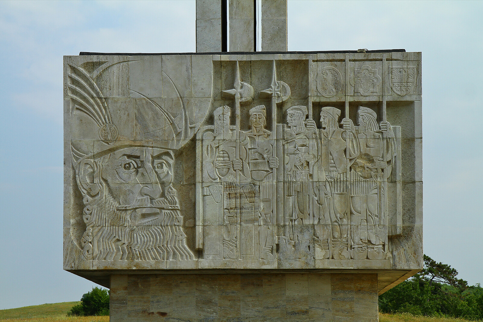 Na cokole znajdują się rzeźbione sceny z bitwy Michała Chrobrego, powyżej trzy wysokie kamienne płyty z herbami.