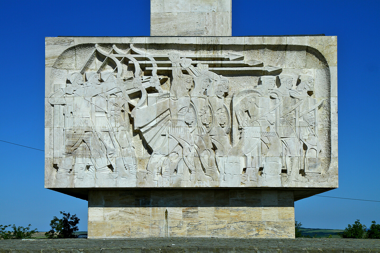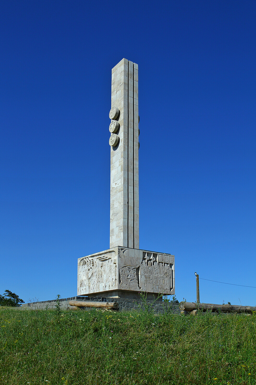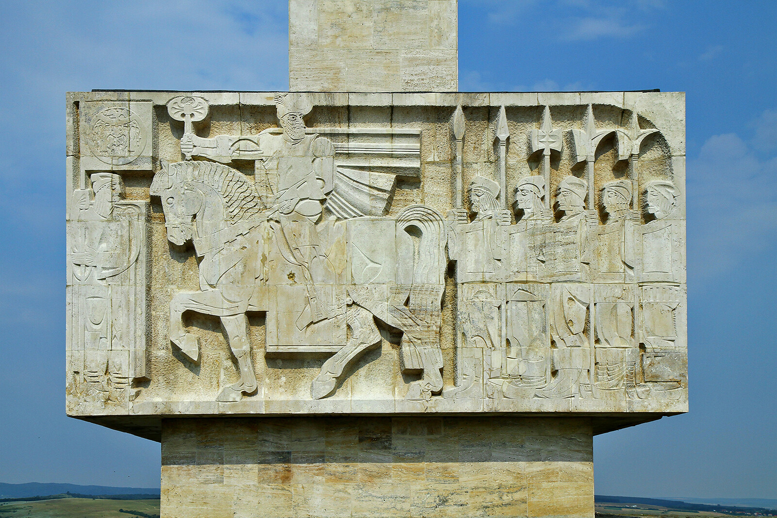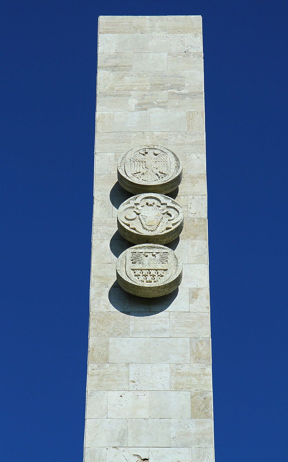 Na cokole znajdują się rzeźbione sceny z bitwy Michała Chrobrego, powyżej trzy wysokie kamienne płyty z herbami.